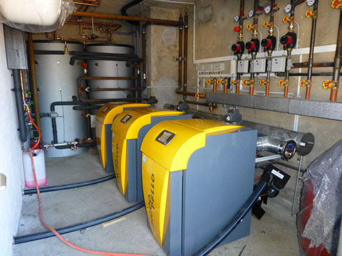 Eine Kaskade aus 3 Pelletkesseln mit zusammen 100 kW Leistung versorgt eine Schule, einen Kindergarten, eine Turnhalle und 2 Wohnungen mit Heizwärme mit maximaler Betriebssicherheit. Die Warmwasserbereitung mit einer Leistungsspitze von 65 Liter / Minute ist mit Hochleistungsdurchlauftauschern aus Edelstahlwellrohr in die Speicher integriert. Außerdem werden die Pufferspeicher von Flachkollektoren mit einer Fläche von 20m² erwärmt. Der Hausmeister muß nur alle 6 Wochen im Winter die Asche entleeren, Arbeitsaufwand ca. 0,5 h.
