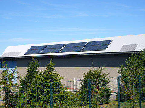 Hein Dahlinger Turnhalle in Kiel mit einer Flachkollektorfläche von 60m² für Beheizung und 24 Duschen.