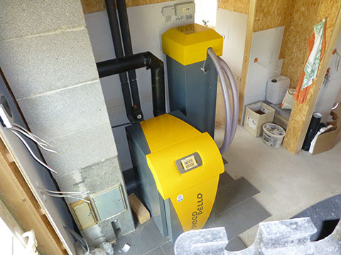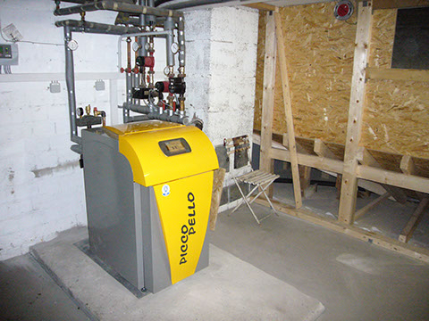 Ein PiccoPello-Pelletkessel neben einem vom Bauherrn selbst errichteten Pelletlager