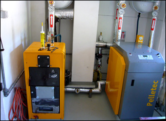 Pelletkessel Pelletec rechts und ein alter Feststoffkessel zur Verbrennung von Stückholz