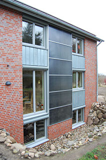 Dieses Bild zeigt einen Sonnenkollektor an einem Passivhaus, der ohne Übergänge direkt in die Gebäudehülle integriert ist.
