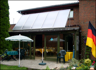 Flachkollektor mit einer Fläche von 10m2 als Freiaufstellung auf einem Wintergarten zur Beschattung im Hochsommer